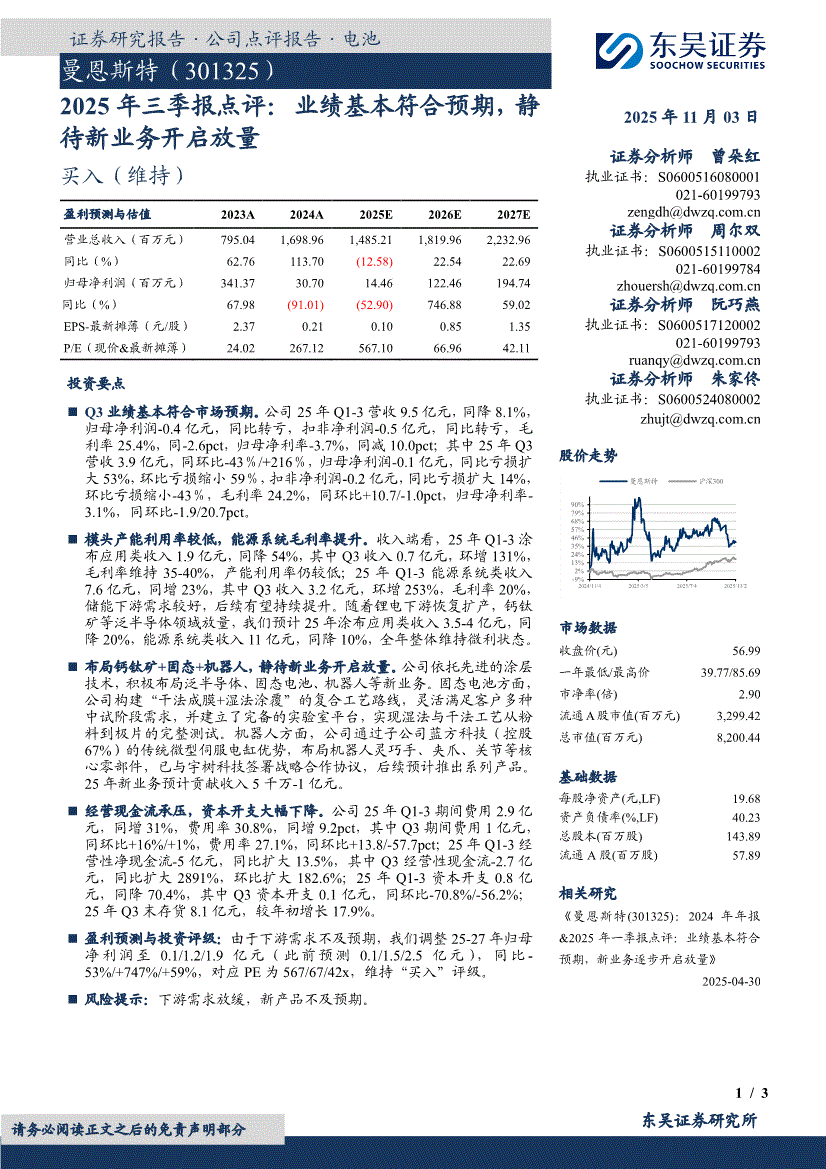 曼恩斯特:东吴证券-曼恩斯特-301325-2025年三季报点评:业绩基本符合预期,静待新业务开启放量-251103