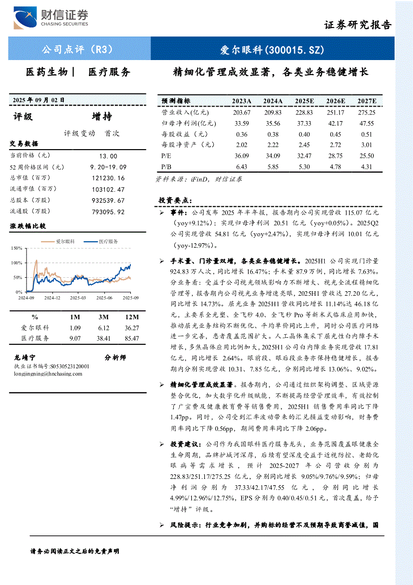 爱尔眼科:财信证券-爱尔眼科-300015-精细化管理成效显著,各类业务稳健增长-250902