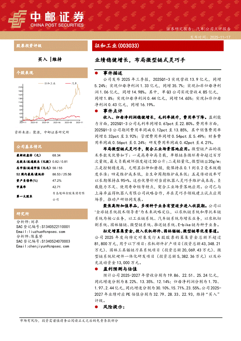 征和工业:中邮证券-征和工业-003033-业绩稳健增长,布局微型链式灵巧手-251117