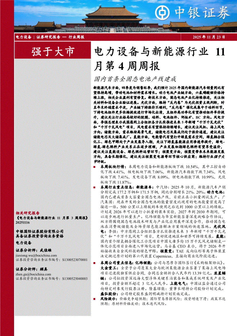 电力设备与新能源行业:中银国际-电力设备与新能源行业11月第4周周报:国内首条全固态电池产线建成-251123
