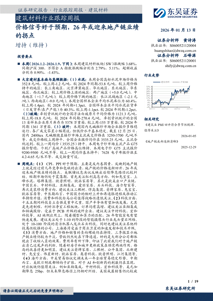 建筑材料行业:东吴证券-建筑材料行业跟踪周报:价格信号好于预期,26年或迎来地产链业绩的拐点-260113