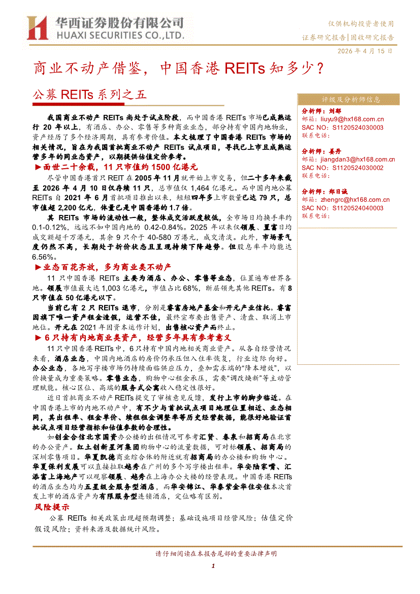 华西证券-公募REITs系列之五:商业不动产借鉴,中国香港REITs知多少?-260415