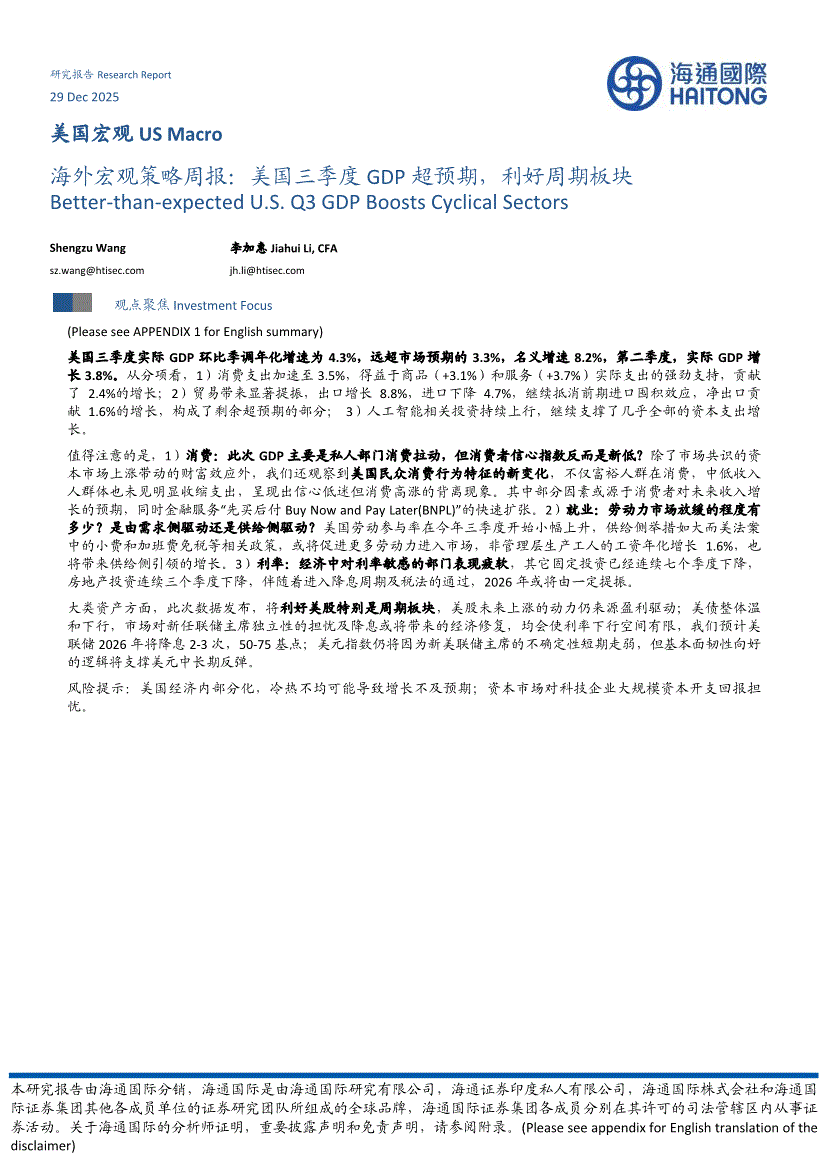 海通国际-海外宏观策略周报:美国三季度GDP超预期,利好周期板块-251229
