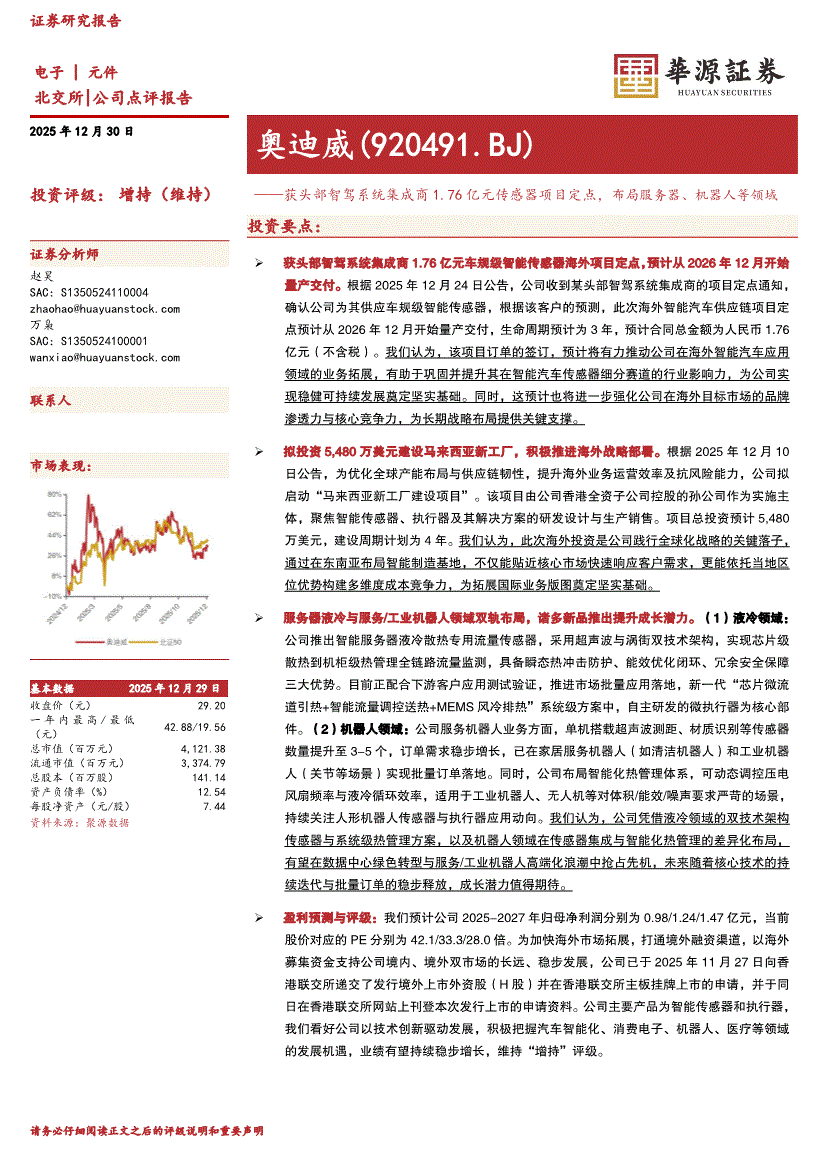 奥迪威:华源证券-奥迪威-920491-获头部智驾系统集成商1.76亿元传感器项目定点,布局服务器、机器人等领域-251230