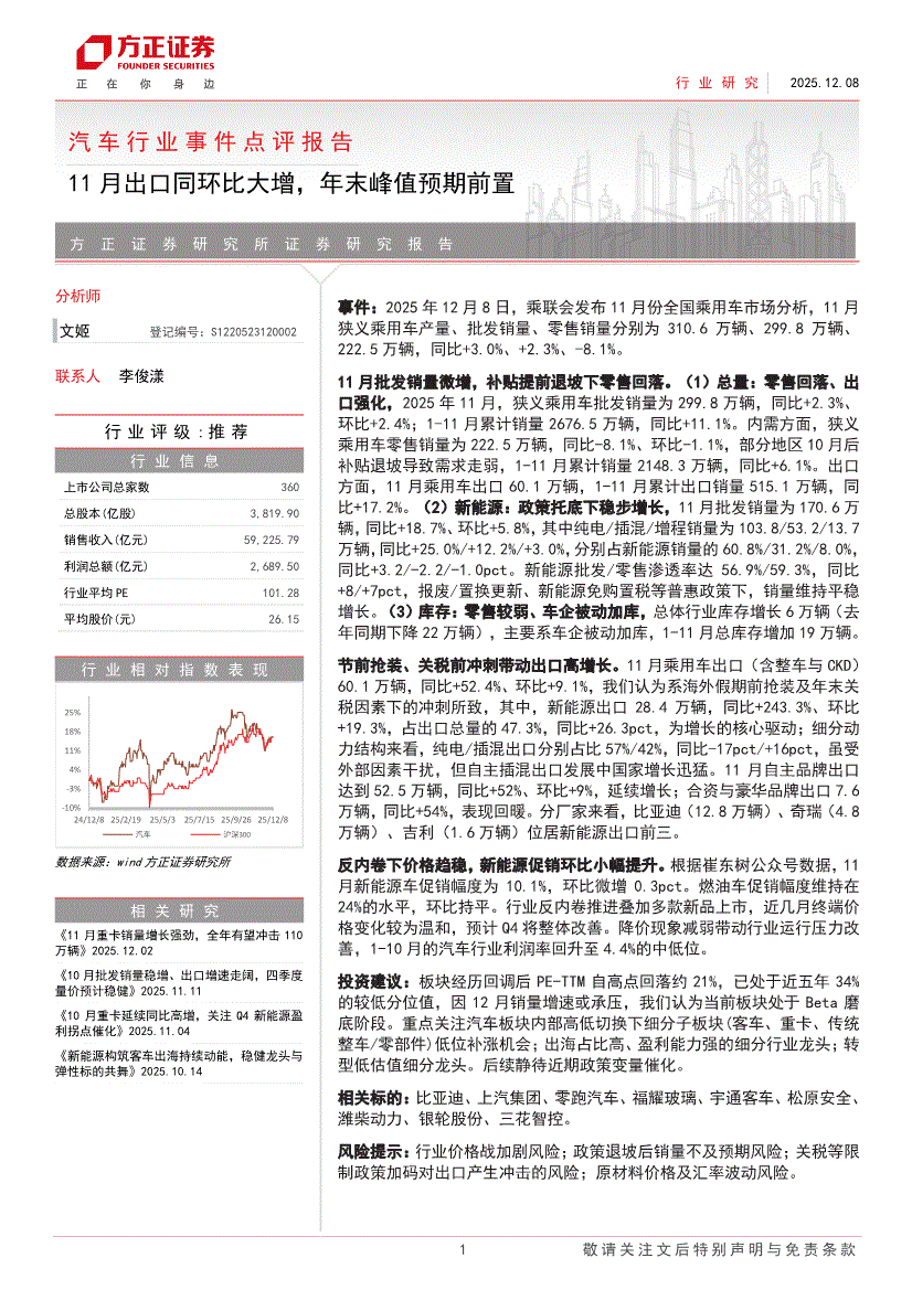 汽车行业:方正证券-汽车行业事件点评报告:11月出口同环比大增,年末峰值预期前置-251208