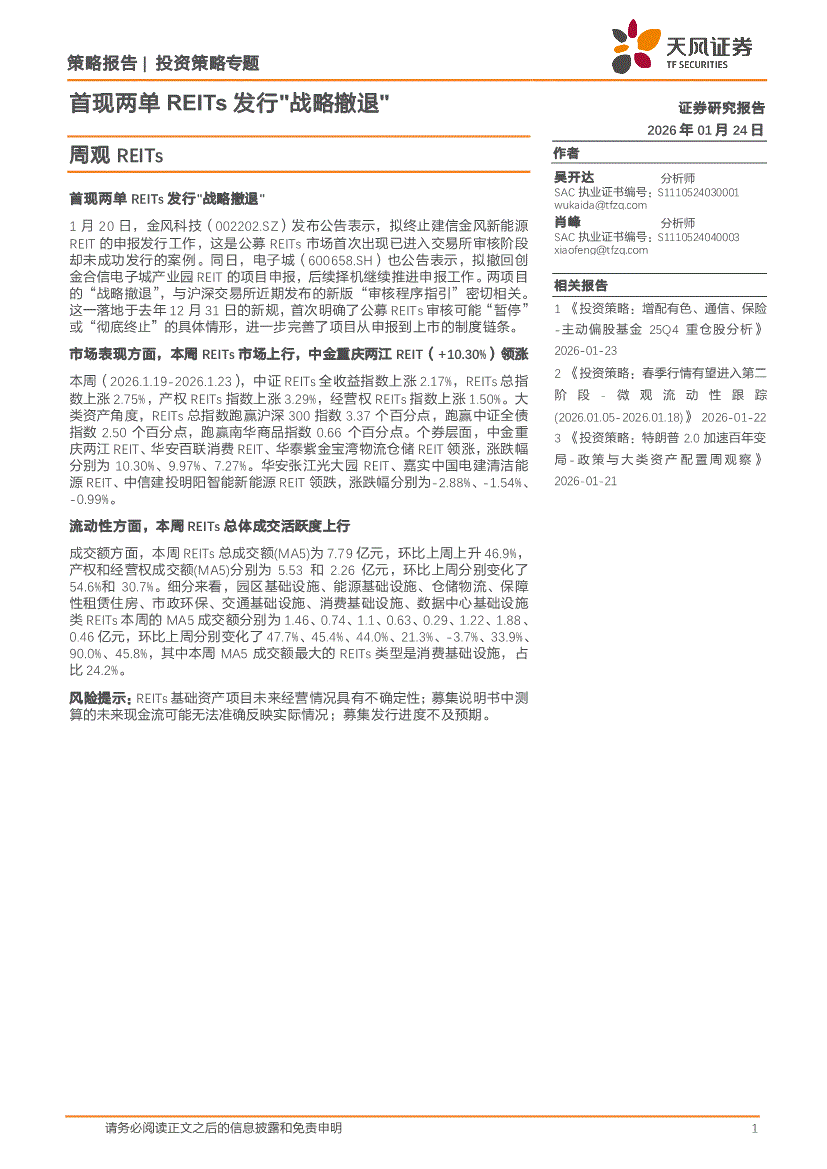 天风证券-周观REITs:首现两单REITs发行"战略撤退"-260124