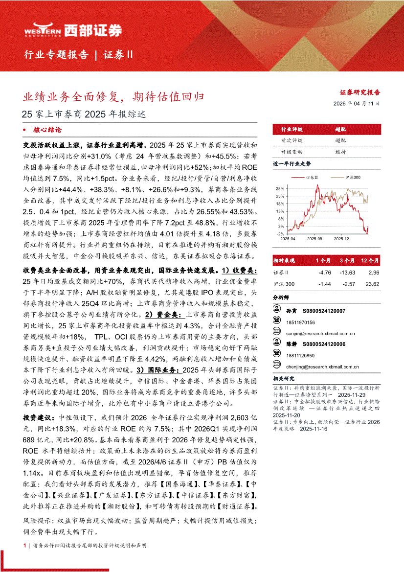 证券行业:西部证券-证券行业25家上市券商2025年报综述:业绩业务全面修复,期待估值回归-260411