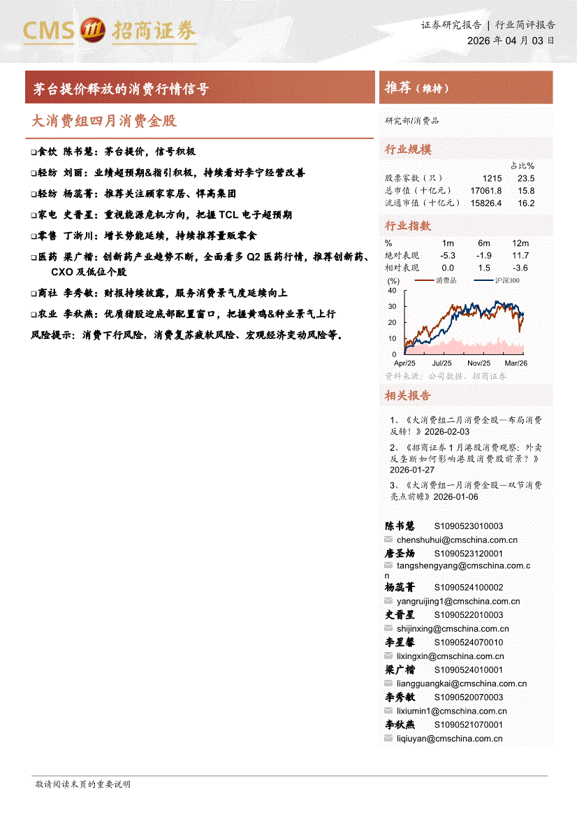 消费品行业:招商证券-消费品行业大消费组四月消费金股:茅台提价释放的消费行情信号-260403