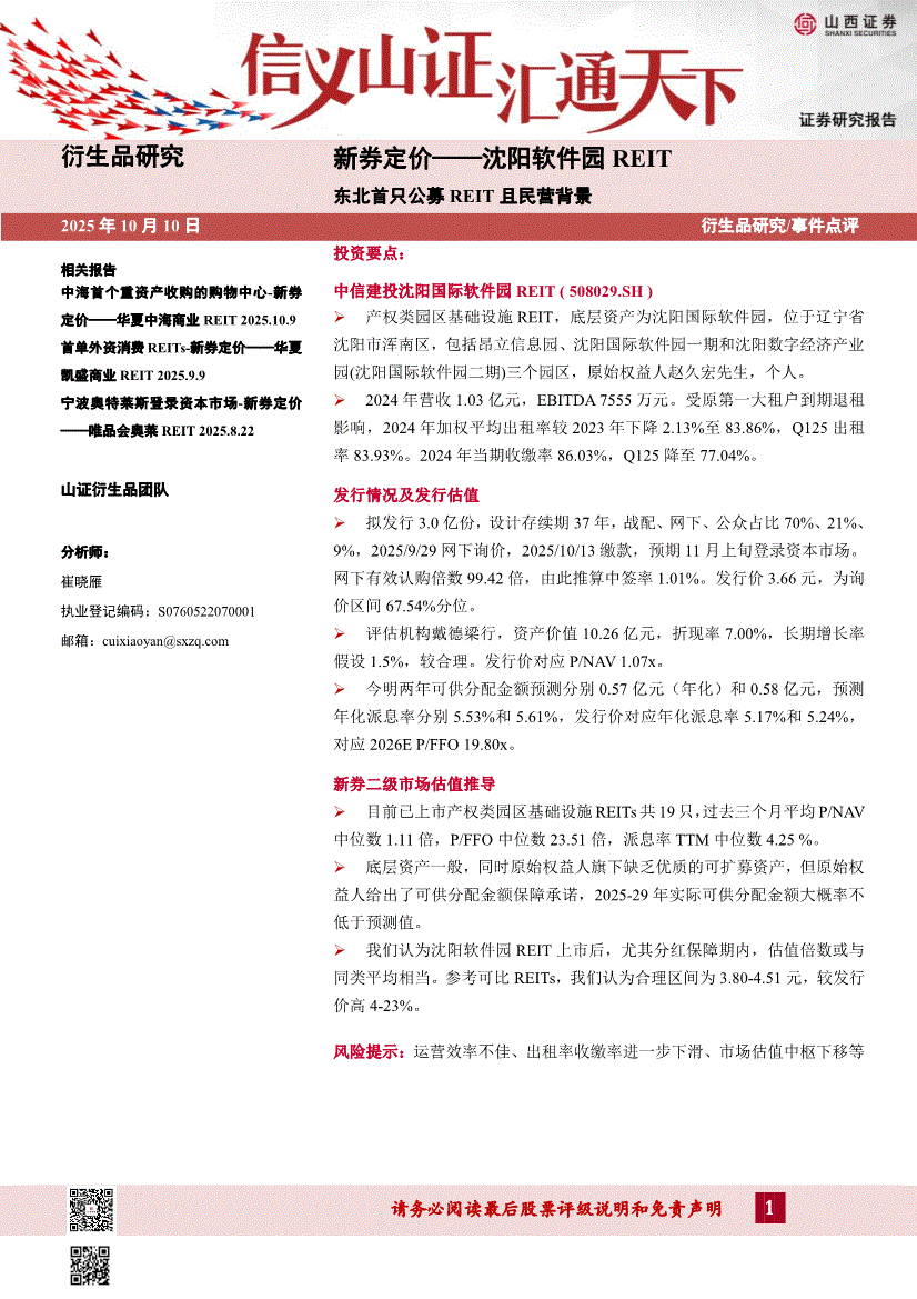 山西证券-新券定价——沈阳软件园REIT:东北首只公募REIT且民营背景-251010