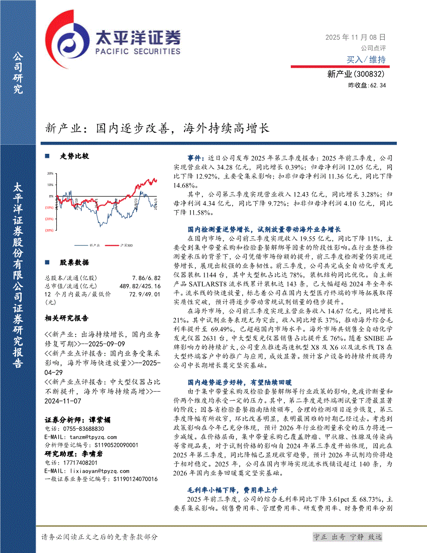 新产业:太平洋证券-新产业-300832-国内逐步改善,海外持续高增长-251108