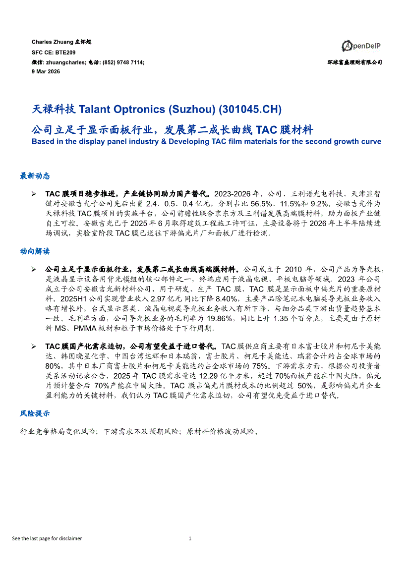 天禄科技:环球富盛-天禄科技-301045-公司立足于显示面板行业,发展第二成长曲线TAC膜材料-260309