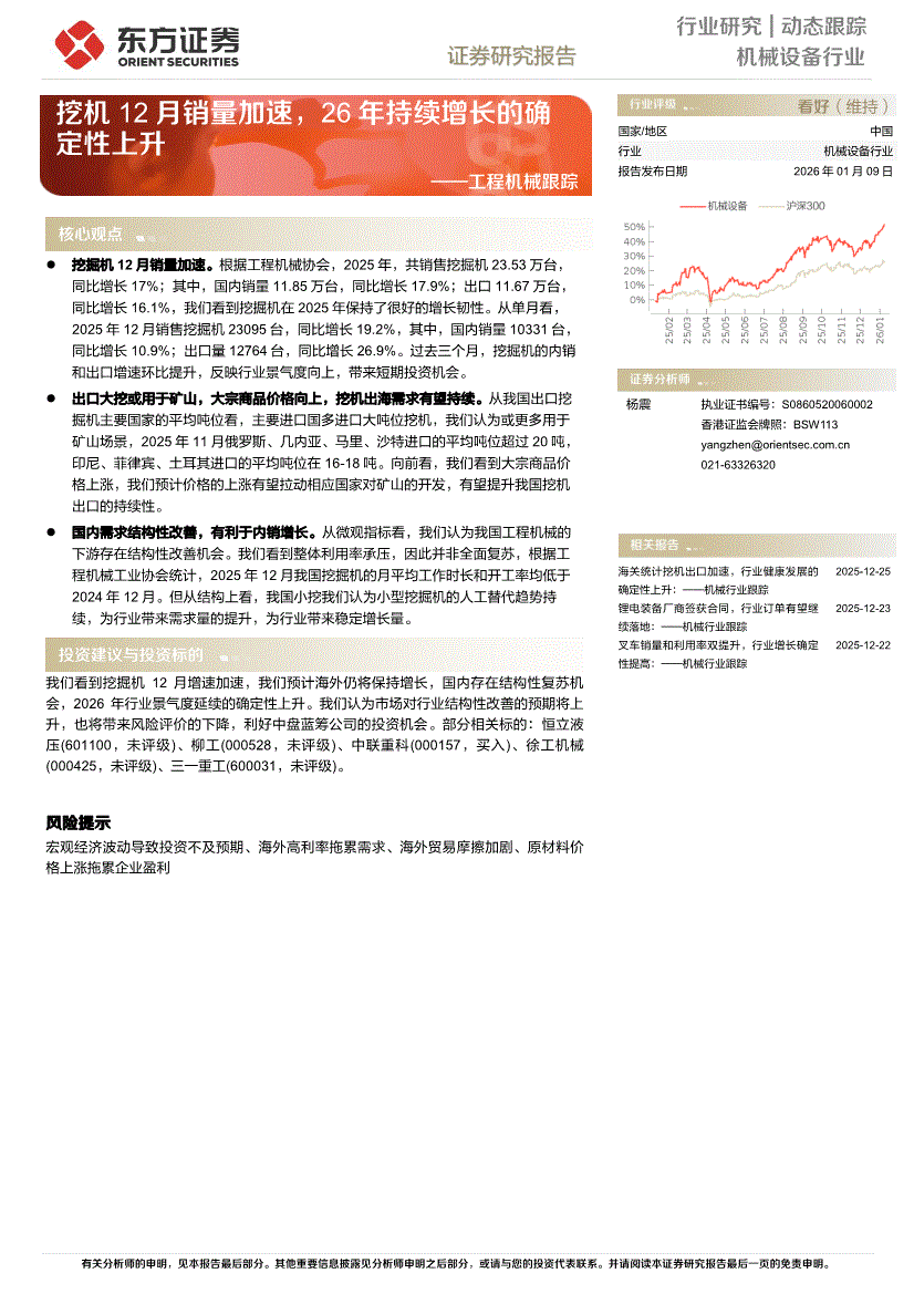 工程机械行业:东方证券-工程机械行业跟踪:挖机12月销量加速,26年持续增长的确定性上升-260109