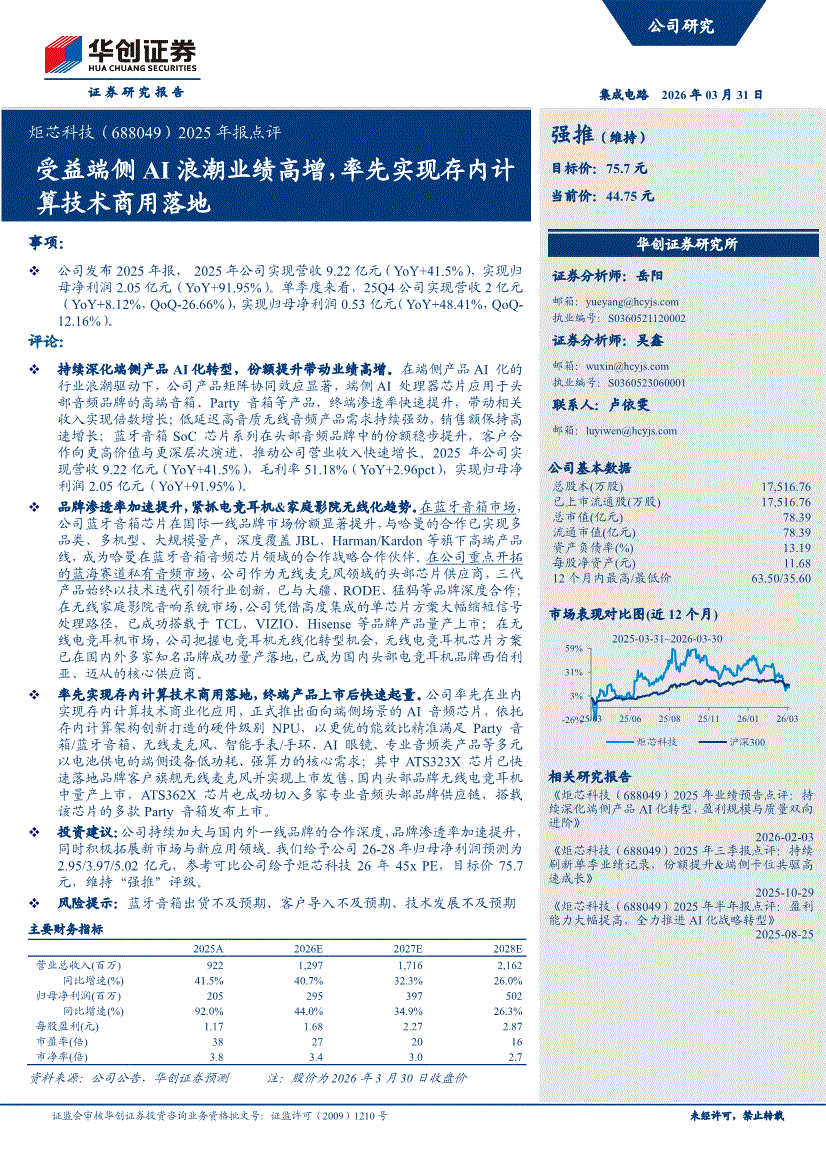 炬芯科技:华创证券-炬芯科技-688049-2025年报点评:受益端侧AI浪潮业绩高增,率先实现存内计算技术商用落地-260331