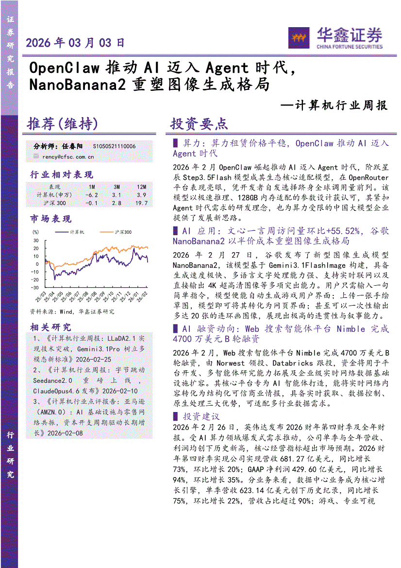 计算机行业:华鑫证券-计算机行业周报:OpenClaw推动AI迈入Agent时代,NanoBanana2重塑图像生成格局-260303