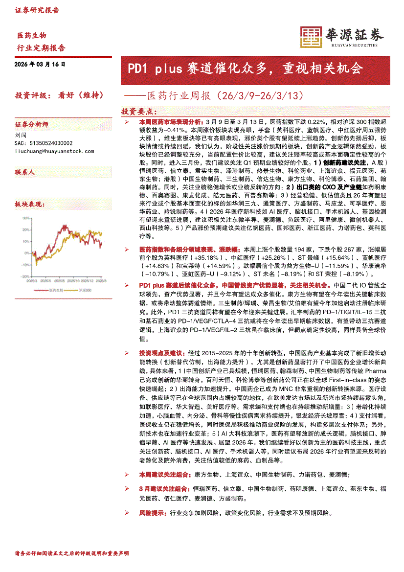 医药行业:华源证券-医药行业周报:PD1 plus赛道催化众多,重视相关机会-260316