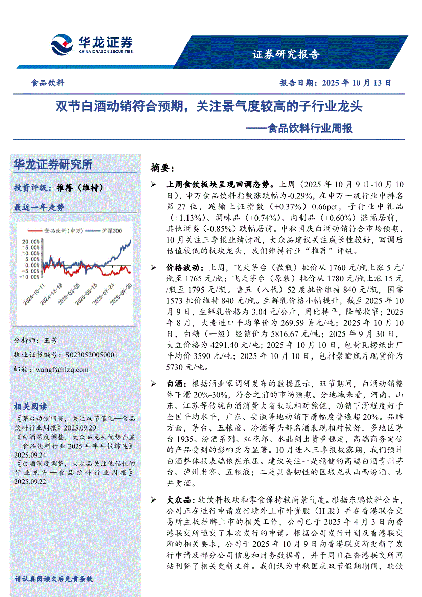 食品饮料行业:华龙证券-食品饮料行业周报:双节白酒动销符合预期,关注景气度较高的子行业龙头-251013