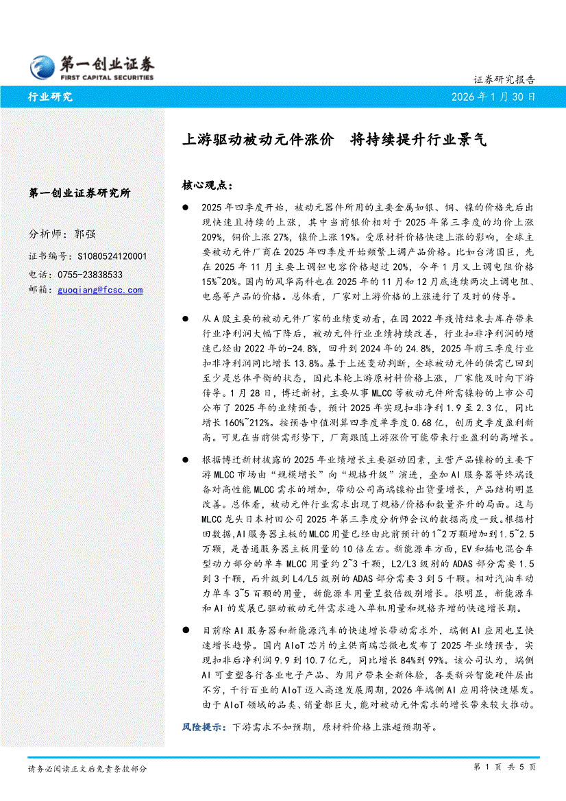 被动元器件行业:第一创业-被动元器件行业:上游驱动被动元件涨价,将持续提升行业景气-260130