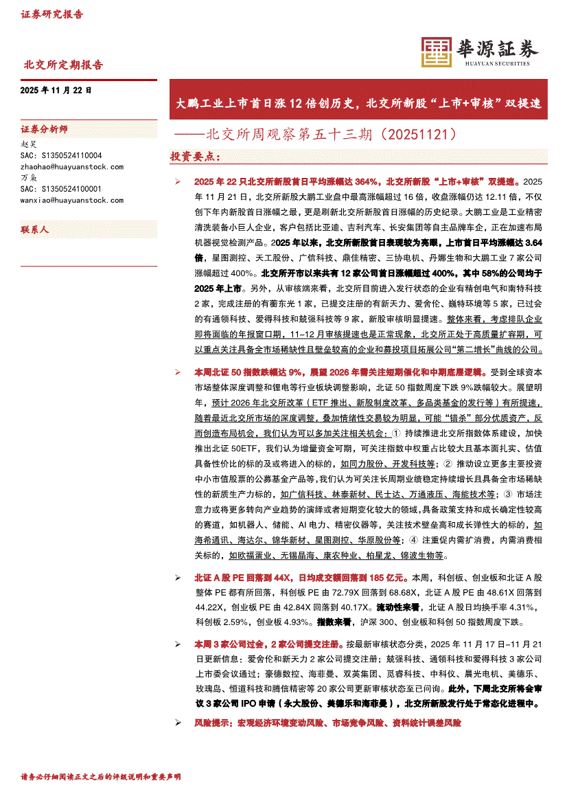 华源证券-北交所周观察第五十三期:大鹏工业上市首日涨12倍创历史,北交所新股“上市+审核”双提速-251122