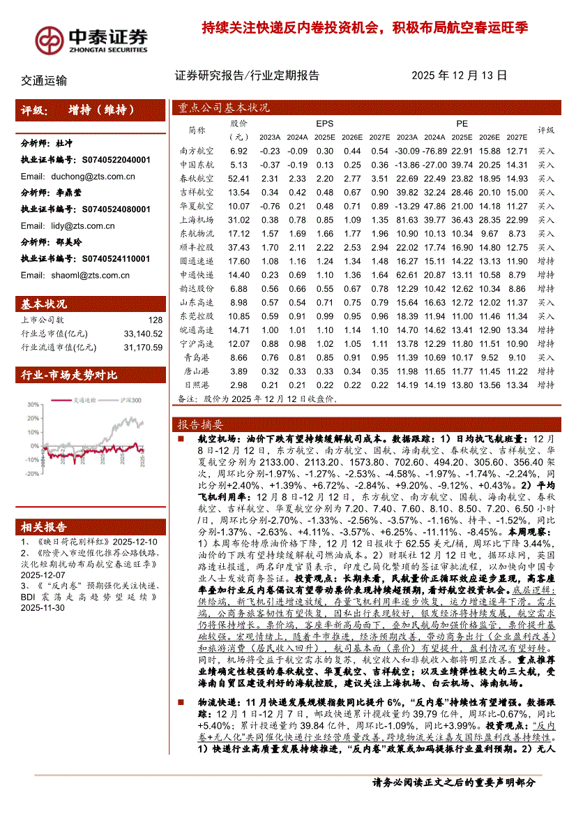 交通运输行业:中泰证券-交通运输行业:持续关注快递反内卷投资机会,积极布局航空春运旺季-251213