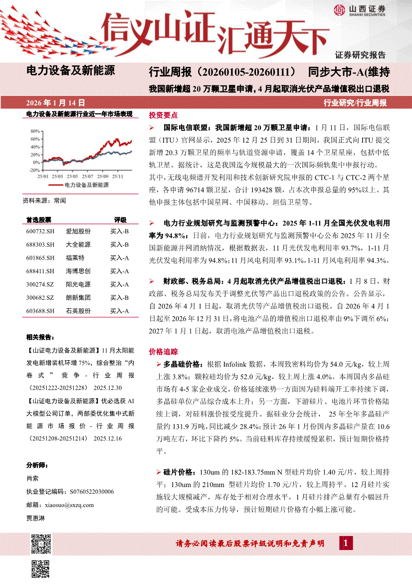 电力设备及新能源行业:山西证券-电力设备及新能源行业周报:我国新增超20万颗卫星申请,4月起取消光伏产品增值税出口退税-260114