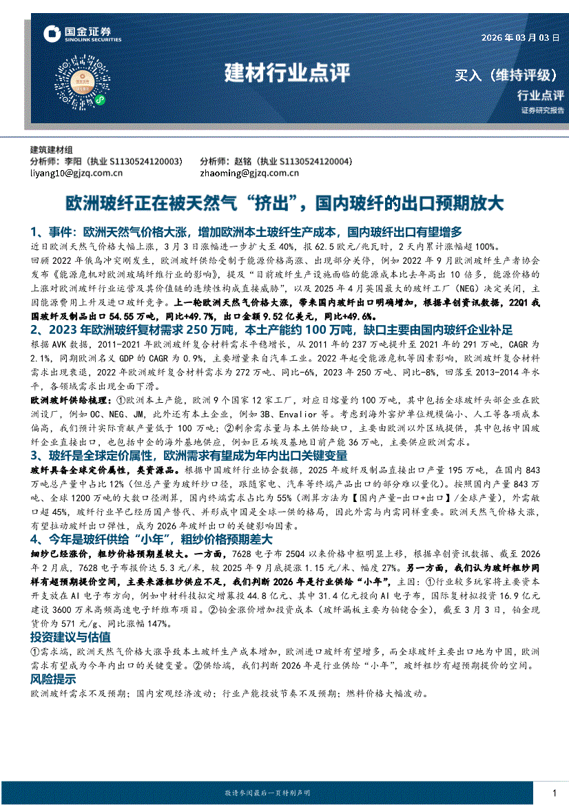 建材行业:国金证券-建材行业点评:欧洲玻纤正在被天然气“挤出”,国内玻纤的出口预期放大-260303