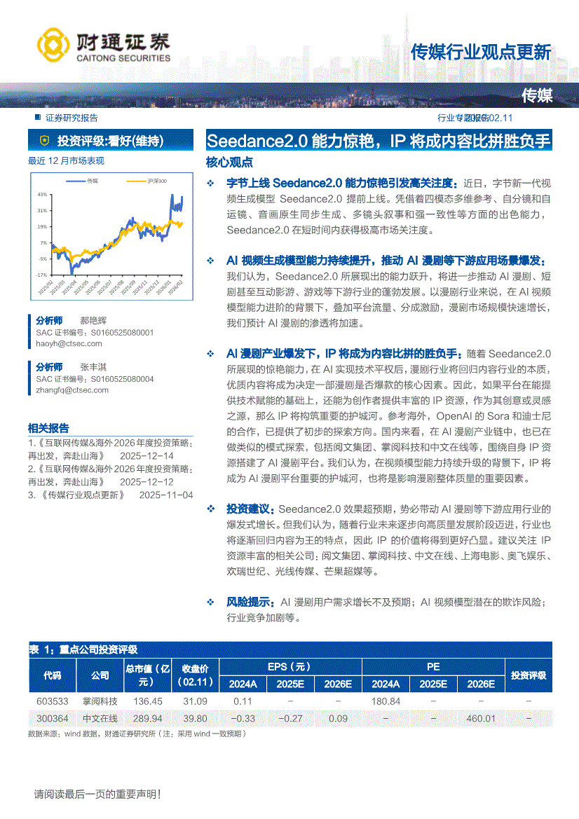 传媒行业:财通证券-传媒行业观点更新:Seedance2.0能力惊艳,IP将成内容比拼胜负手-260211