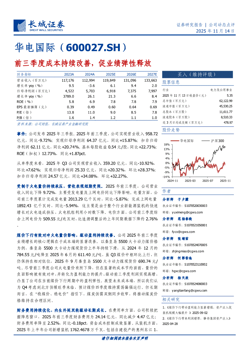 华电国际:长城证券-华电国际-600027-前三季度成本持续改善,促业绩弹性释放-251114