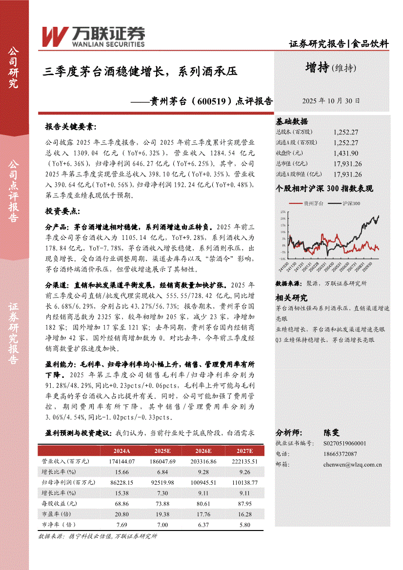 贵州茅台:万联证券-贵州茅台-600519-点评报告:三季度茅台酒稳健增长,系列酒承压-251030