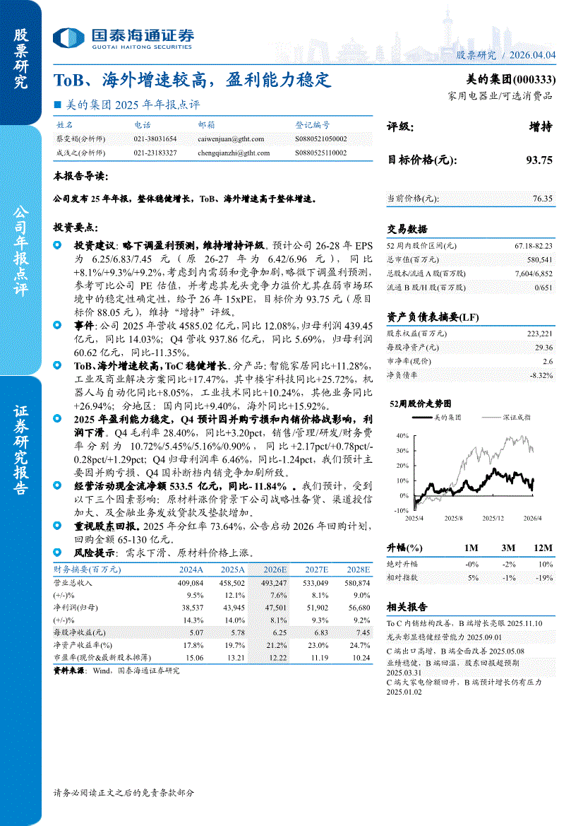 美的集团:国泰海通证券-美的集团-000333-2025年年报点评:ToB、海外增速较高,盈利能力稳定-260404