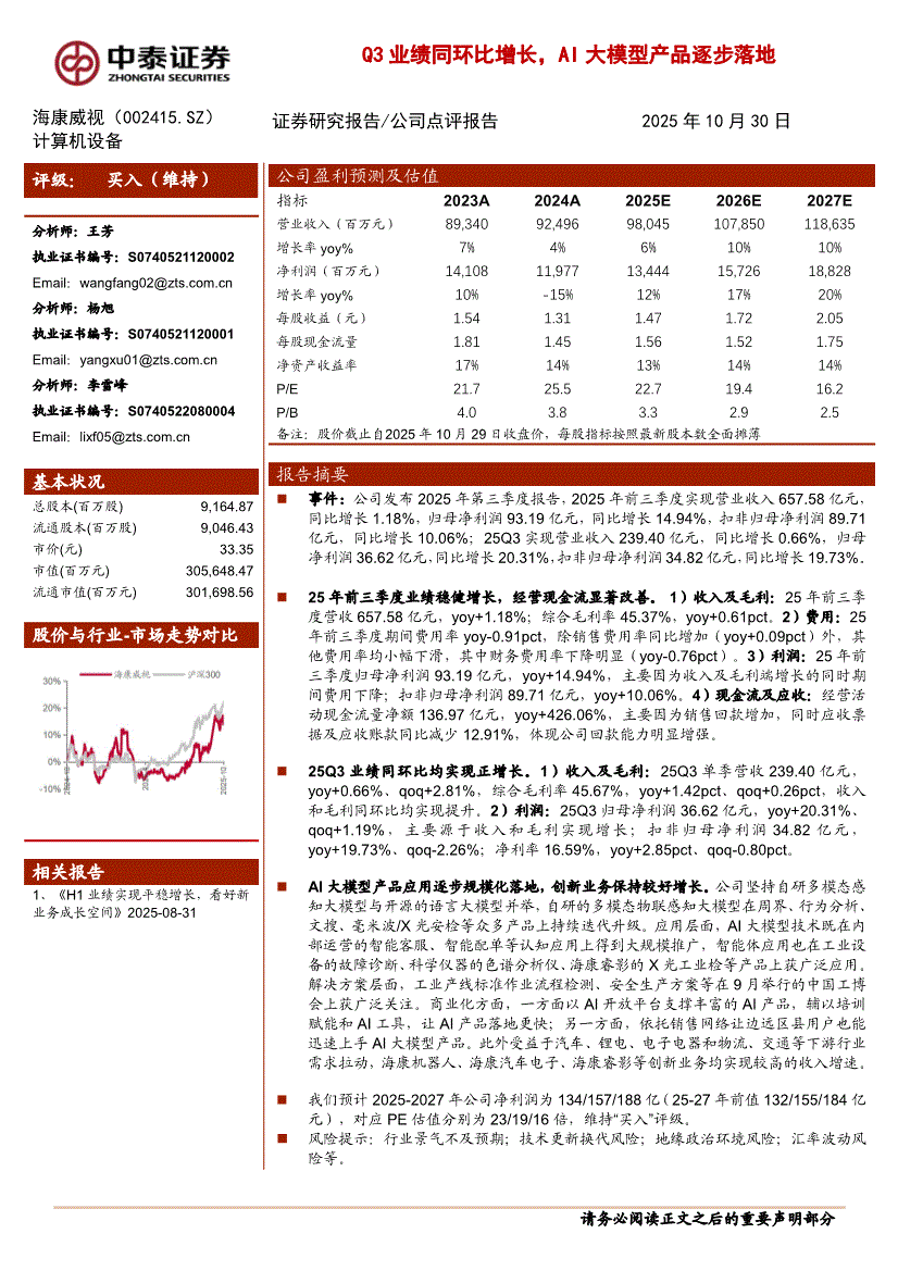海康威视:中泰证券-海康威视-002415-Q3业绩同环比增长,AI大模型产品逐步落地-251030