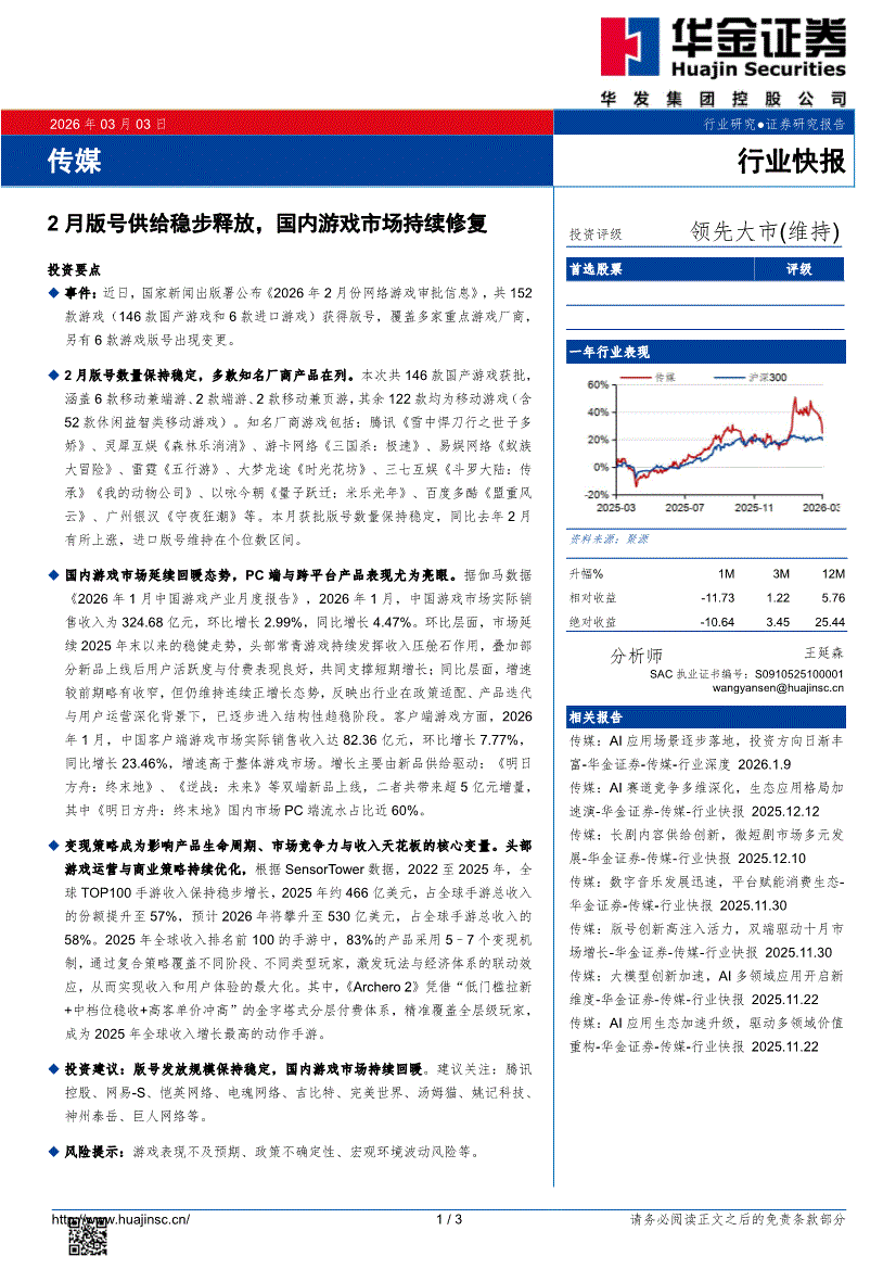 传媒行业:华金证券-传媒行业:2月版号供给稳步释放,国内游戏市场持续修复-260303