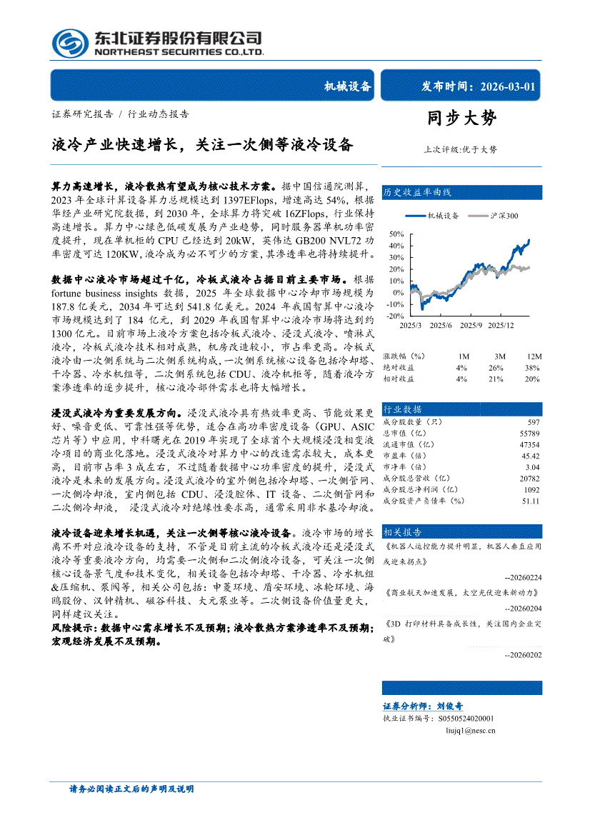 机械设备行业:东北证券-机械设备行业:液冷产业快速增长,关注一次侧等液冷设备-260301