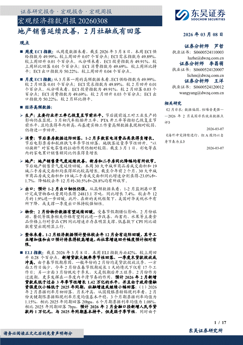 东吴证券-宏观经济指数周报:地产销售延续改善,2月社融或有回落-260308