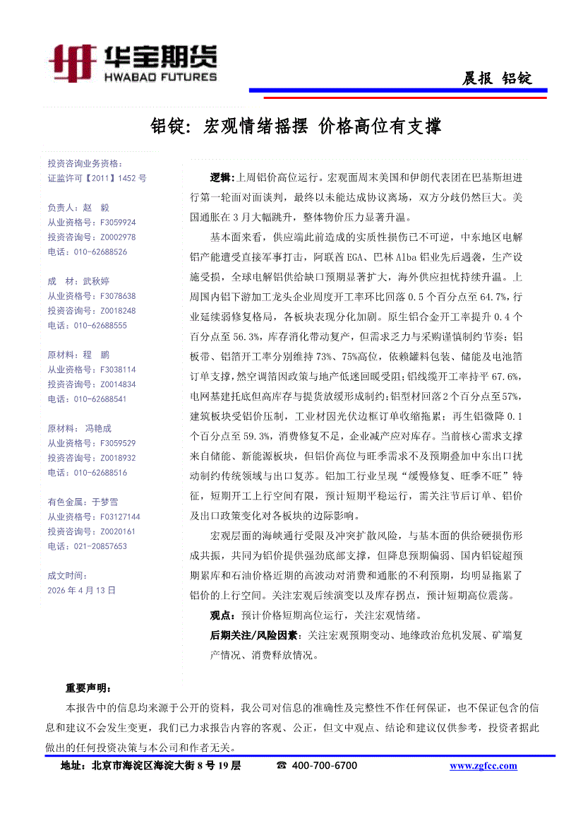 华宝期货-铝锭晨报:宏观情绪摇摆,价格高位有支撑-260413