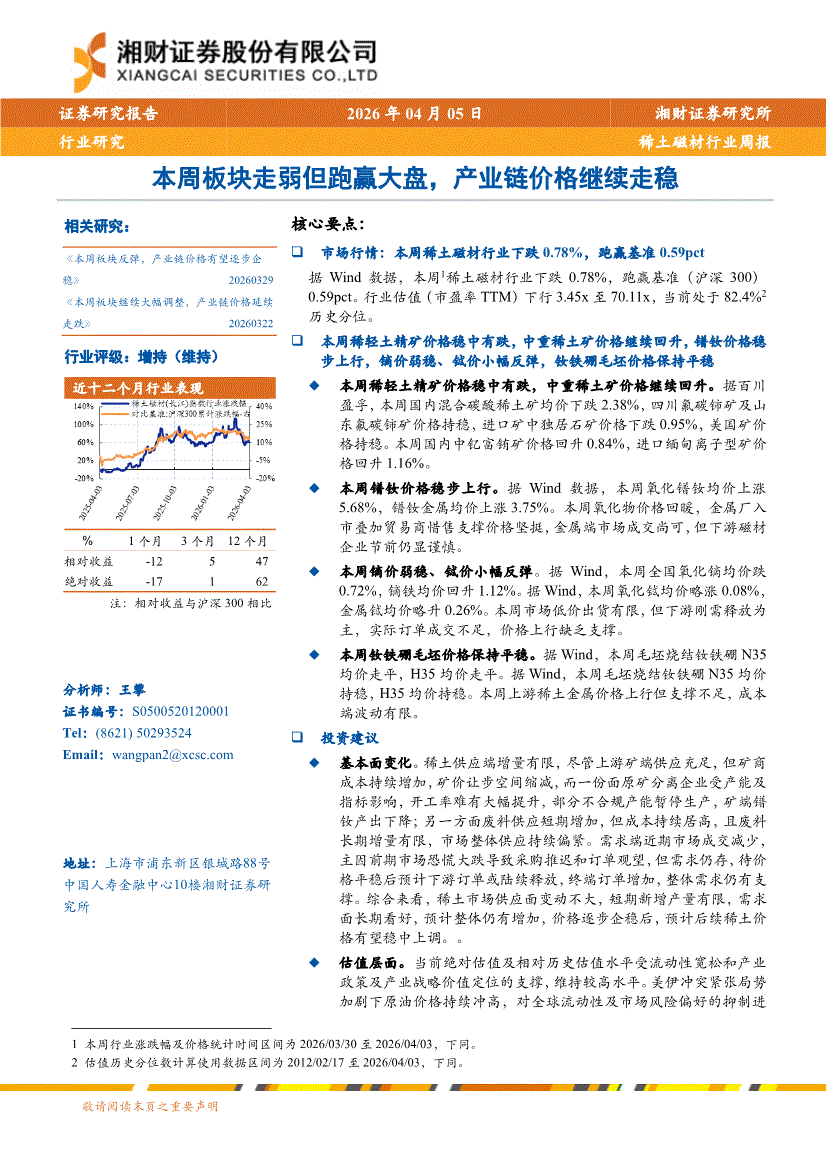 稀土磁材行业:湘财证券-稀土磁材行业周报:本周板块走弱但跑赢大盘,产业链价格继续走稳-260405