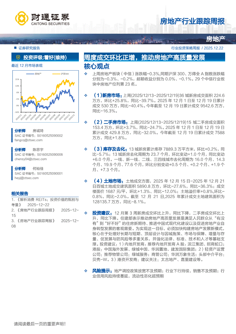 房地产行业:财通证券-房地产行业跟踪周报:周度成交环比正增,推动房地产高质量发展-251222