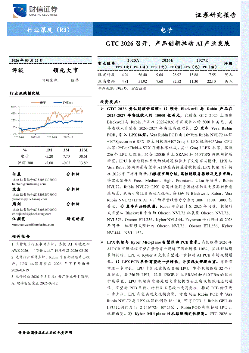 电子行业:财信证券-电子行业深度(R3):GTC 2026召开,产品创新拉动AI产业发展-260322