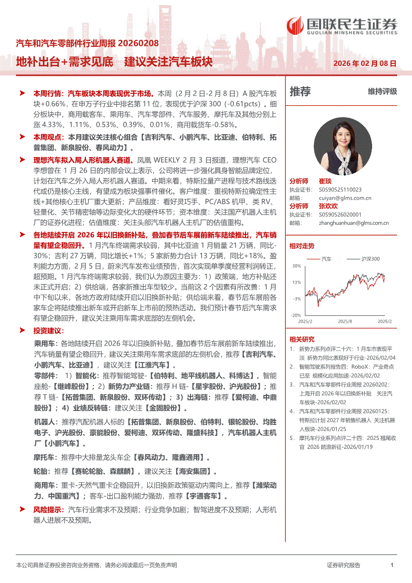 汽车和汽车零部件行业:国联民生证券-汽车和汽车零部件行业周报:地补出台+需求见底,建议关注汽车板块-260208