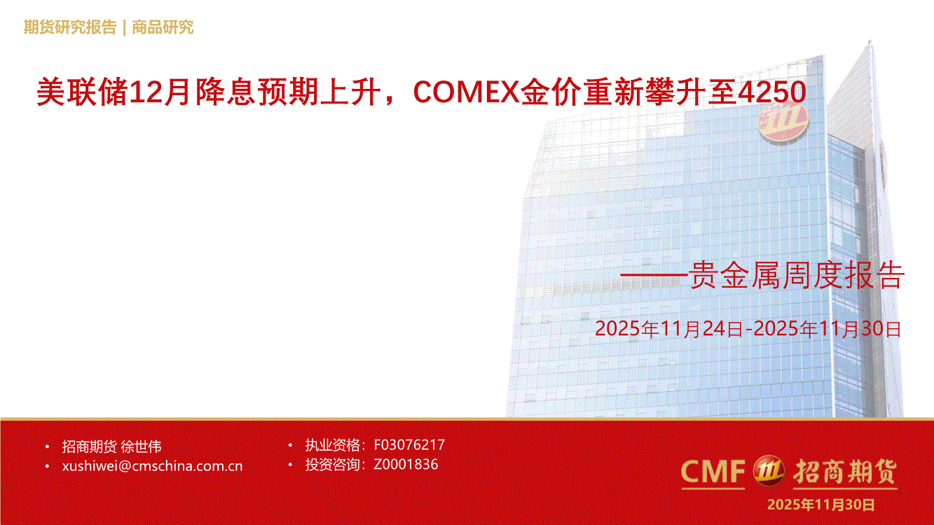 招商期货-贵金属周度报告:美联储12月降息预期上升,COMEX金价重新攀升至4250-251130