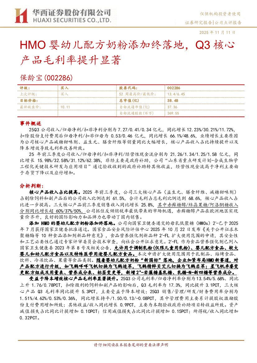 保龄宝:华西证券-保龄宝-002286-HMO婴幼儿配方奶粉添加终落地,Q3核心产品毛利率提升显著-251111