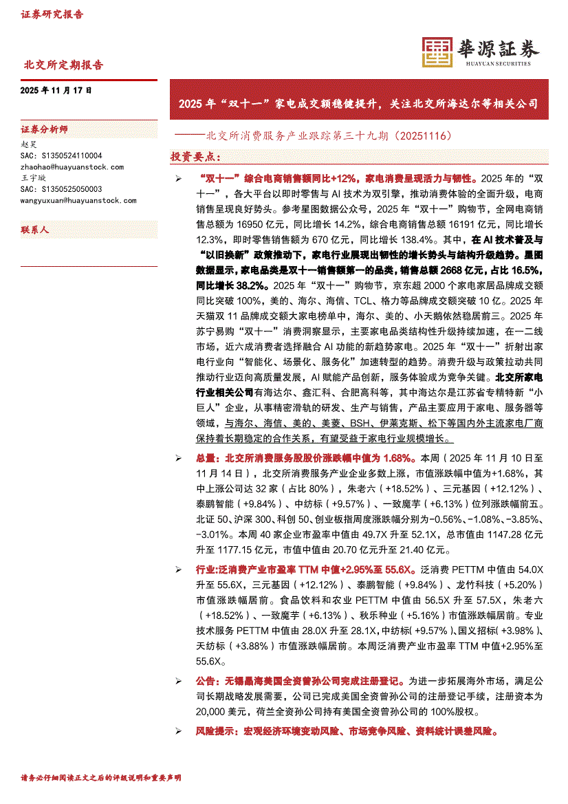 华源证券-北交所消费服务产业跟踪第三十九期:2025年“双十一”家电成交额稳健提升,关注北交所海达尔等相关公司-251117