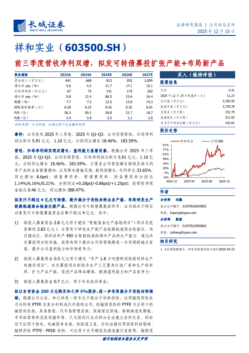 祥和实业:长城证券-祥和实业-603500-前三季度营收净利双增,拟发可转债募投扩张产能+布局新产品-251215