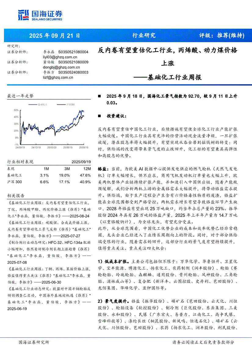 基础化工行业:国海证券-基础化工行业周报:反内卷有望重估化工行业,丙烯酸、动力煤价格上涨-250921