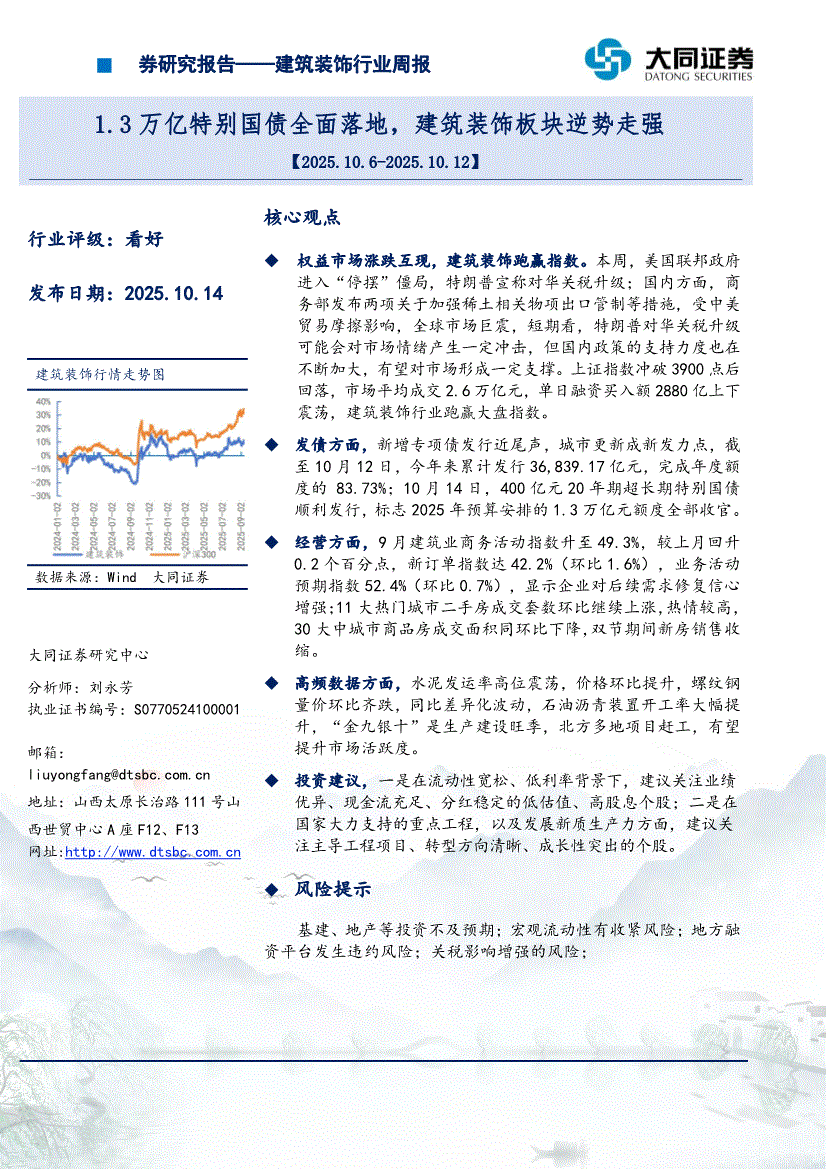 建筑装饰行业:大同证券-建筑装饰行业周报:1.3万亿特别国债全面落地,建筑装饰板块逆势走强-251014