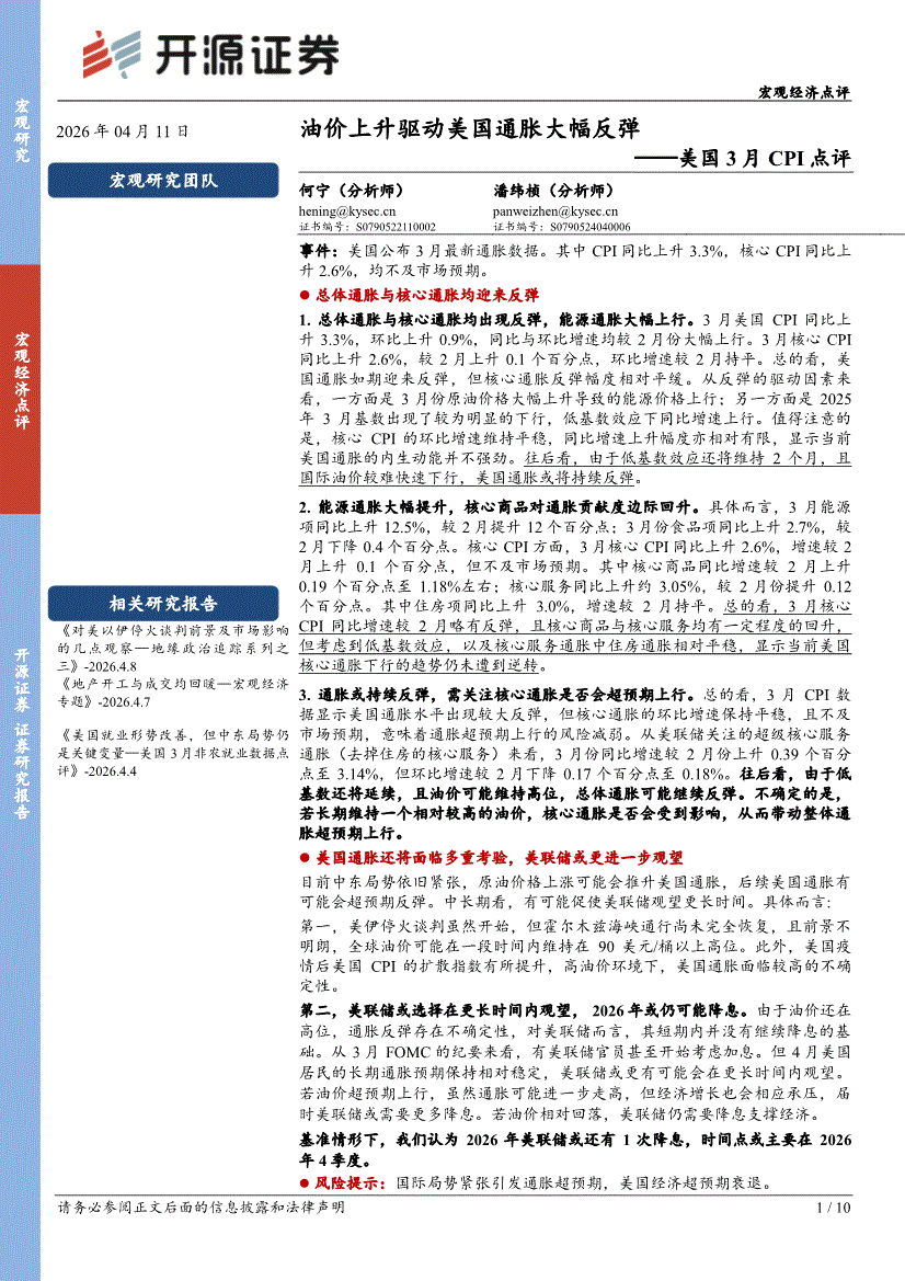 开源证券-美国3月CPI点评:油价上升驱动美国通胀大幅反弹-260411