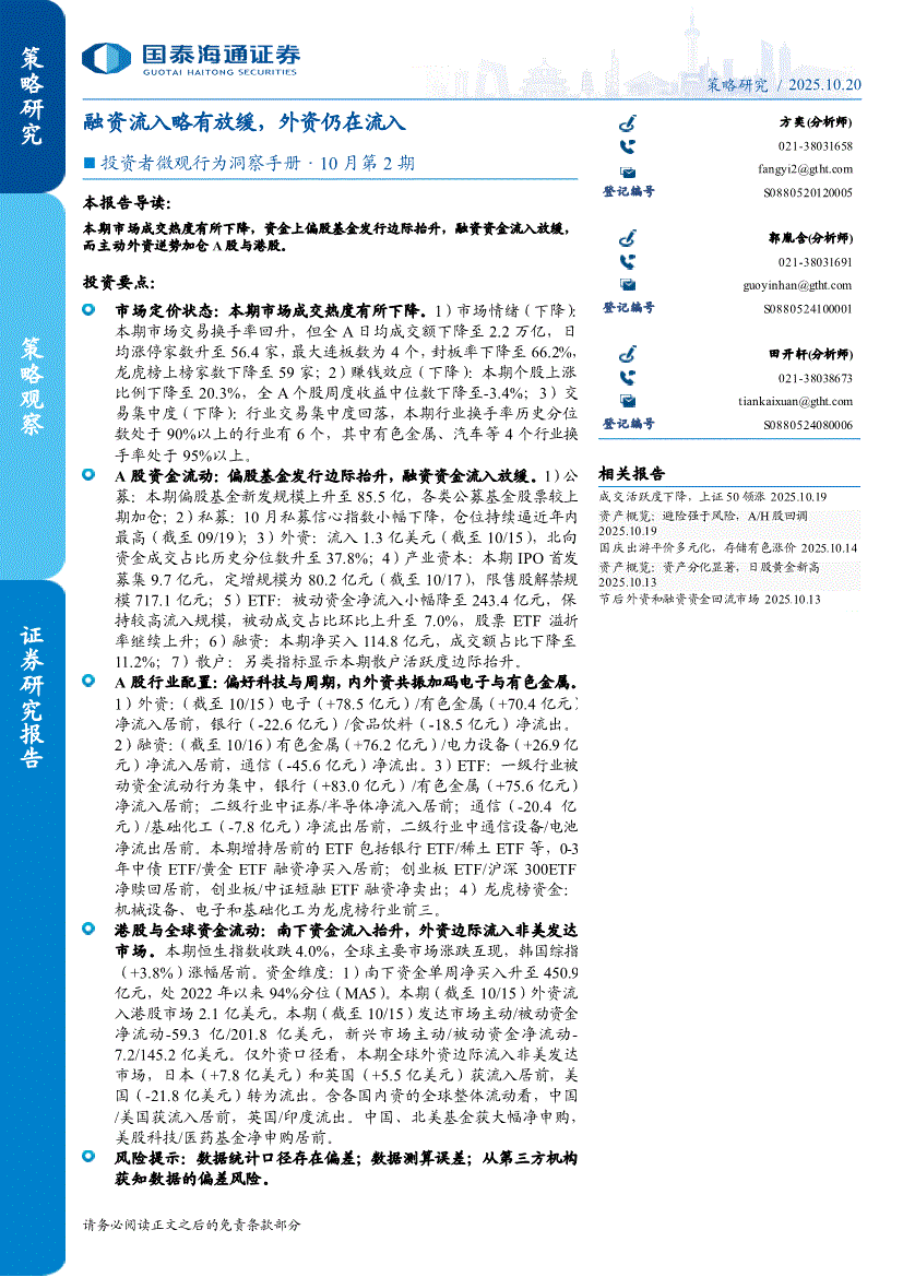 国泰海通证券-投资者微观行为洞察手册·10月第2期:融资流入略有放缓,外资仍在流入-251020