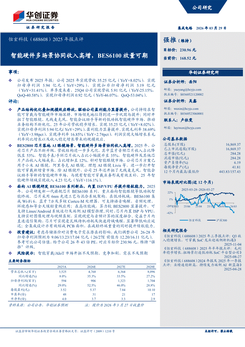 恒玄科技:华创证券-恒玄科技-688608-2025年报点评:智能硬件多场景协同收入高增,BES6100放量可期-260329