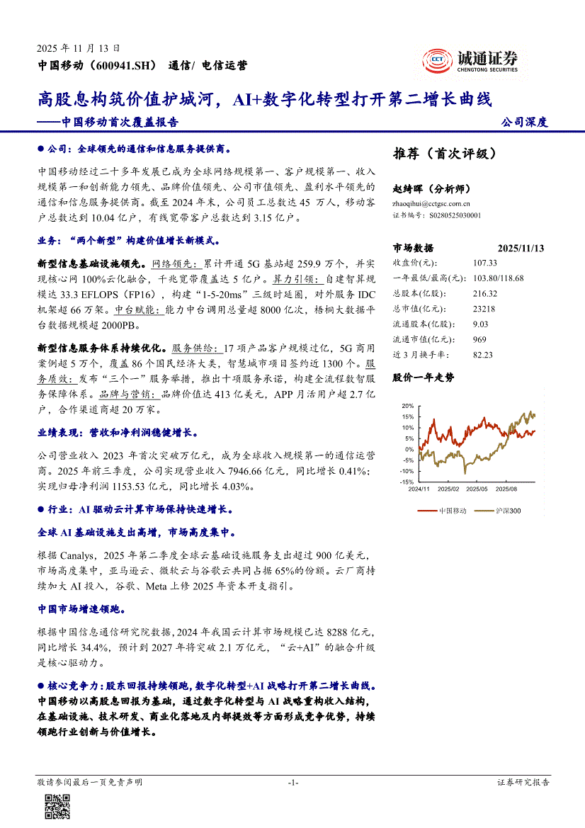 中国移动:诚通证券-中国移动-600941-首次覆盖报告:高股息构筑价值护城河,AI+数字化转型打开第二增长曲线-251113