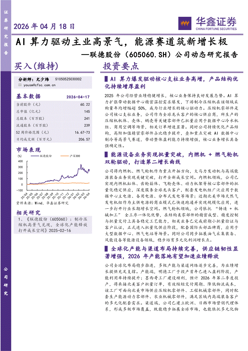 联德股份:华鑫证券-联德股份-605060-公司动态研究报告:AI算力驱动主业高景气,能源赛道筑新增长极-260418
