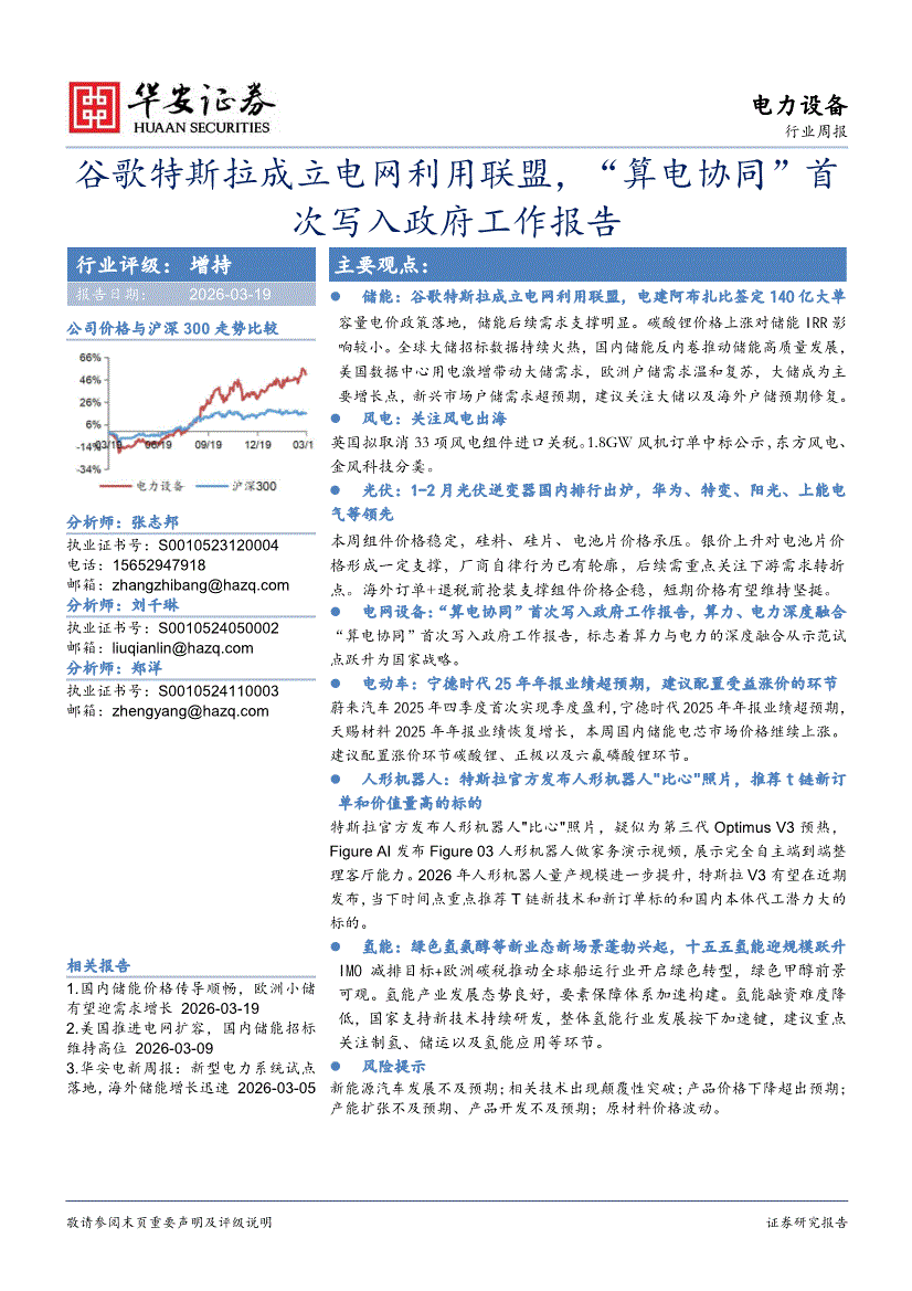 电力设备行业:华安证券-电力设备行业周报:谷歌特斯拉成立电网利用联盟,“算电协同”首次写入政府工作报告-260319